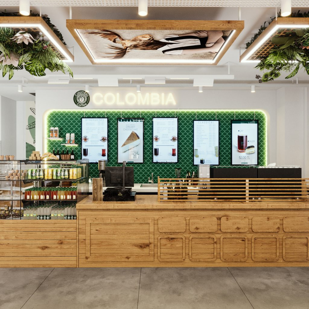 Colombia Coffee’de kahve tutkusunu modern tasarımla buluşturduk. İnsanlara estetik ve samimi bir ortam sunduk. Epply’nin imzası, markayı mekân tasarımında öne çıkaran güçlü bir kimlik kazandırdı.