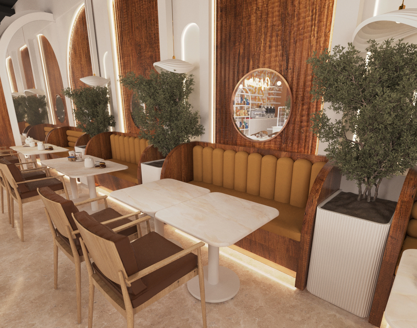 Kafe mimar iç mimarlığı yaklaşımımızı kullanarak misafirlerin konforunu ön planda tutan bir atmosfer yarattık. İstanbul iç mimarlık vizyonumuzu uluslararası ölçekte sergileyerek, modern çizgilerle geleneksel detayları harmanladık.